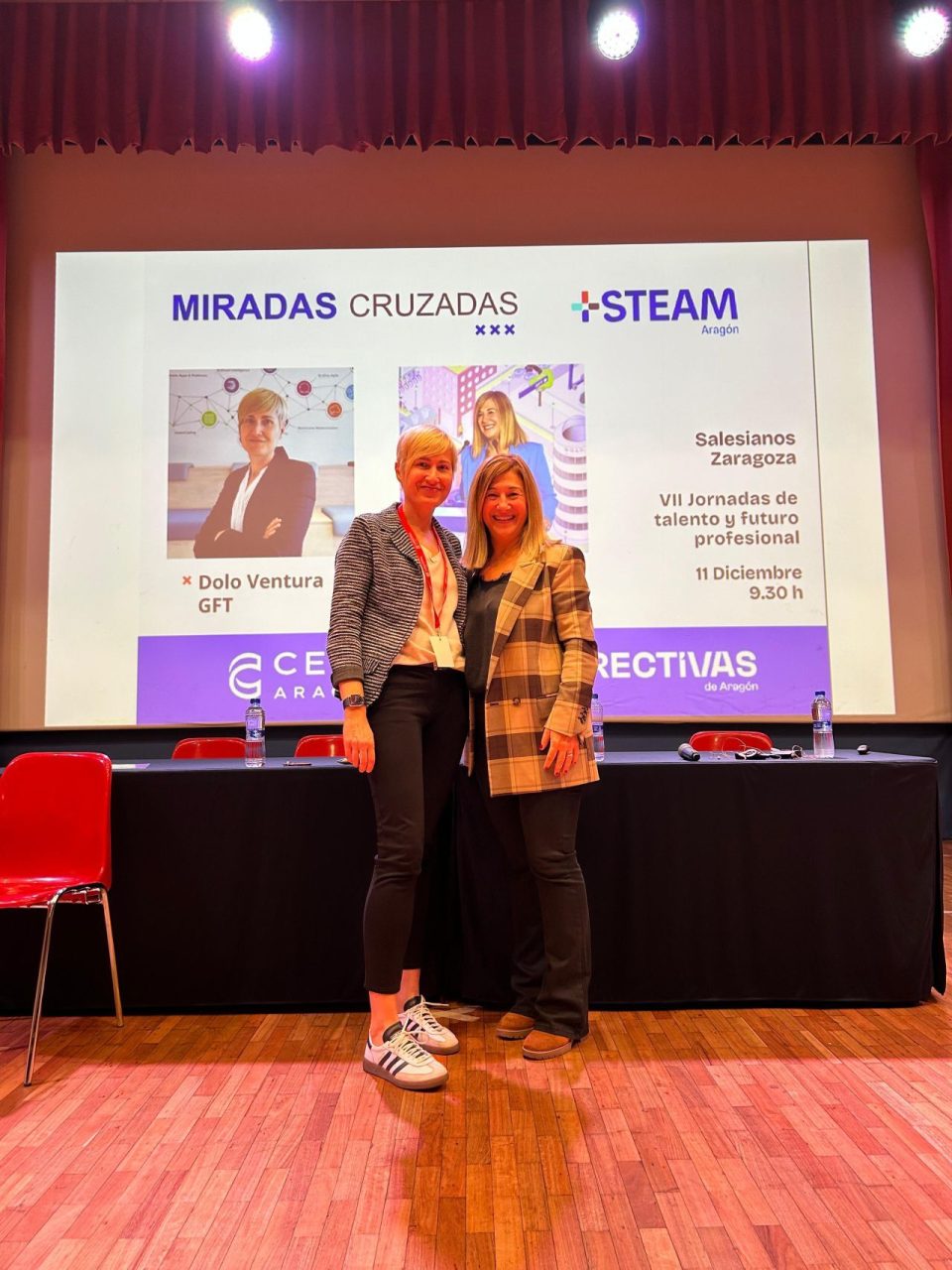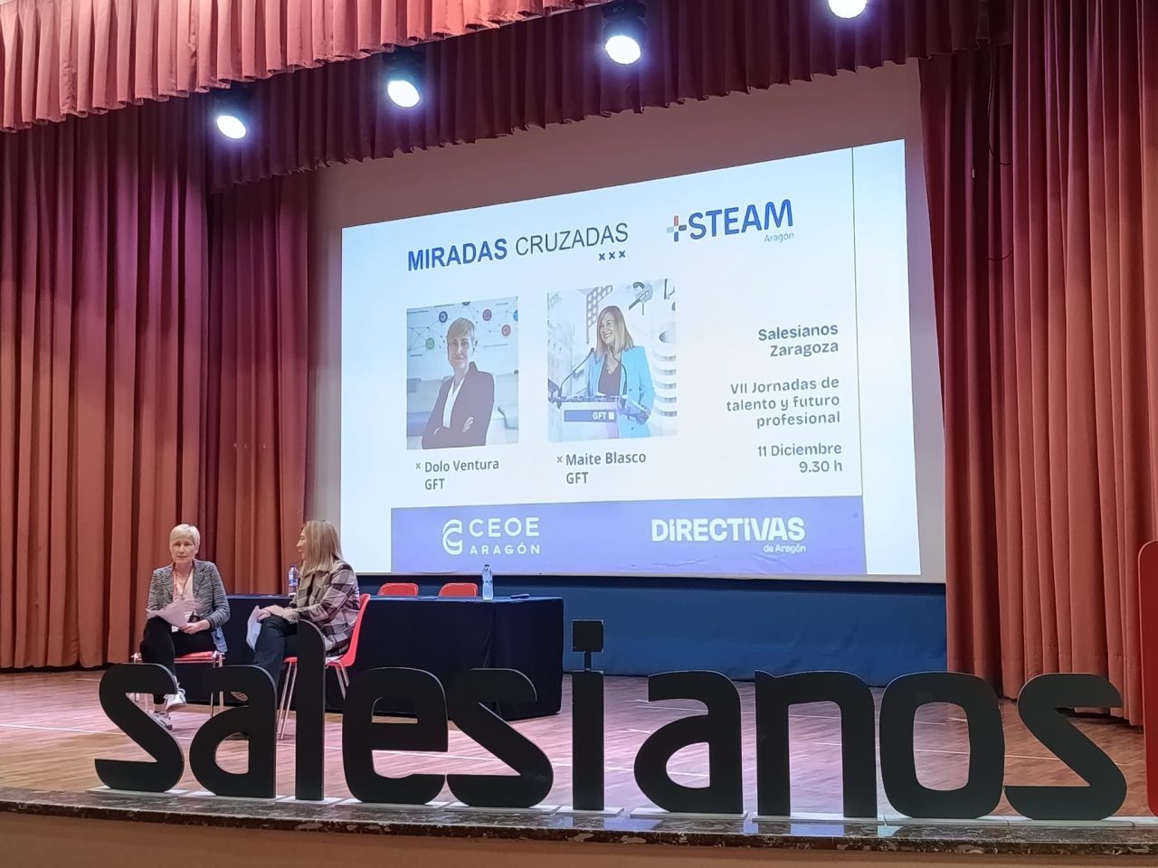 El pasado 11 de noviembre, en el marco de las Jornadas de Talento y Futuro Profesional, organizadas por Salesianos Zaragoza, hemos desarrollado una nueva sesión del formato MIRADAS CRUZADAS, el foro de diálogo e inspiración de Directivas de Aragón, bajo el título “Rompiendo mitos del profesional tecnológico”, con la participación de Maite Blasco, socia de Directivas de Aragón y Directora ejecutiva en GFT y Dolo Ventura, Jefa de proyectos en GFT.
